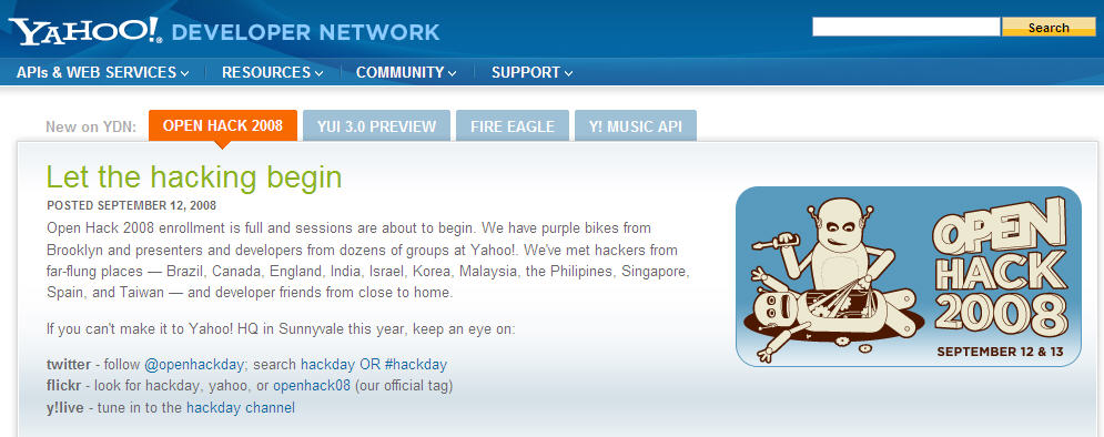 เมื่อวันศุกร์ที่ผ่านมาที่ Yahoo! ที่สำนักงานใหญ่ใน Sunnyvale จัดงาน Open Hack Day 2008 ครับ งานนี้เป็นการรวมตัวของชุมชนนักพัฒนาที่มาจากข้างนอก โดยทั้งหมดมาจากกลยุทธ์ YOS (Yahoo! Open Strategy) ที่เปิดให้นักพัฒนาสามารถเข้ามามีส่วนร่วมในการพัฒนา Yahoo! ร่วมกัน โดยมีนักพัฒนาหลายร้อยคนจากทั่ว Silicon Valley มาแจมกัน ผมว่าถ้าผมเป็นนักพัฒนาผมก็คิดนะครับว่า ผมมีโอกาสที่จะได้พัฒนาอะไรสักอย่างกับเว็บที่มีผู้ใช้มากกว่า 500 ล้านคนต่อเดือนทั่วโลก และมีขาประจำล็อกออนเข้ามาบ่อยๆ อย่างน้อย 300 ล้านคนต่อวัน คือมันก็ได้ลองของลองวิชา และถึงผมไม่สนใจคนใช้ของทาง Yahoo! ผมก็ยังมีเทคโนโลยีให้ใช้ฟรีอยู่ดี