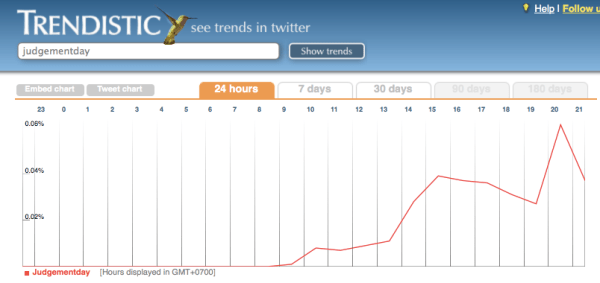 สิ่งที่เกิดขึ้นก็คือนับตั้งแต่เช้ายันเย็นวันนั้น ผมแทบไม่ได้ทำงานอย่างอื่นกัน นอกจากติดตามข่าวคราวอย่างใกล้ชิด และพยายามที่จะบอกกับชุมชนคนไทยใน Twitter ว่า “กรุณาช่วยกันใช้ #judgementday ด้วยนะครับ” ในตอนนั้นมีชาว Twitter หลายท่านเริ่มใช้ Hashtag อื่นๆ บ้างแล้ว เช่น #76000 #thai1 ที่นำเสนอข่าวได้ดีอยู่แล้ว ผมเองก็ไม่ได้คิดว่าจะแข่งขันอะไร