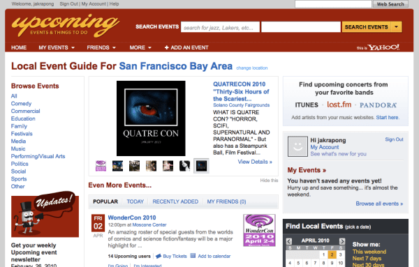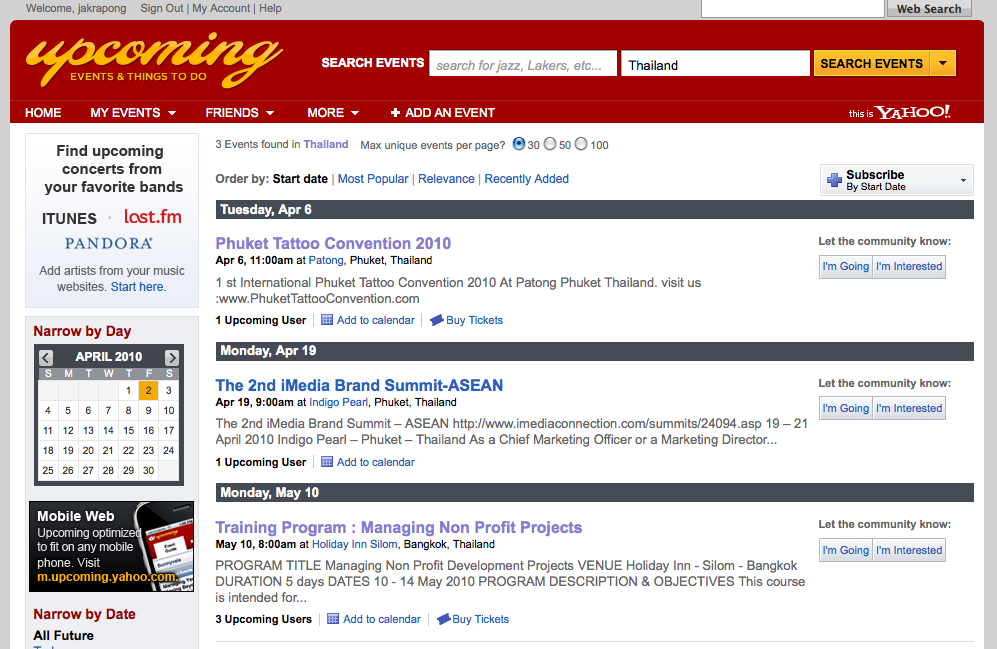 เวลาพูดถึงเว็บที่ Yahoo! เคยซื้อไปรวมกิจการ หลายๆ คนจะนึกถึงเว็บแชร์รูปภาพชื่อดังอย่าง Flickr และ Social bookmark อย่าง Del.icio.us ทั้งสองเว็บนี้ถูกซื้อในปี 2005 ช่วงที่กระแส Web 2.0 กำลังแรงๆ แต่ก็มีอีกเว็บนึงครับ ที่ Yahoo! ซื้อแล้วค่อนข้างเงียบในกระแสสื่อ แต่ว่ามีคนใช้เยอะอย่างต่อเนื่อง เว็บนั้นก็คือ บริการ Social Event ที่ชื่อว่า Upcoming.yahoo.com (เดิมชื่อว่า Upcoming.org) และผมมองว่ามีประโยชน์มาก โดยเฉพาะถ้าหากว่าคุณเป็นคนจัดอีเวนท์ระดับนานาชาติในเมืองไทย