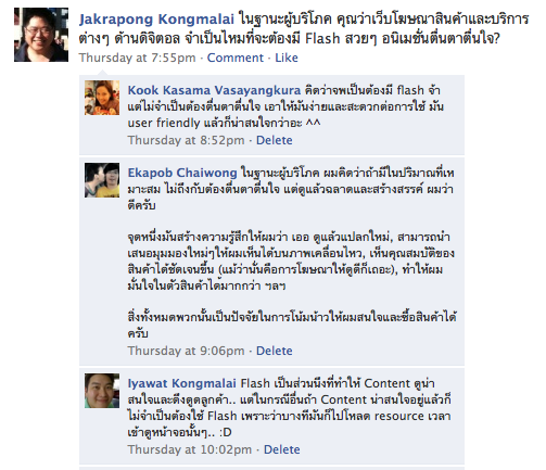 วันก่อนผมเห็นเว็บบริษัทตัวเองมี Flash เยอะมาก รู้สึกไม่ค่อยชอบเพราะมันโหลดช้า ผมแค่ต้องการหาข้อมูลเท่านั้นเอง ทำไมต้องให้มาโหลดอะไรยุ่งยากแบบนี้ ก็เลยลองถามเพื่อนๆ ใน Facebook + Twitter ว่า “ในฐานะผู้บริโภค คุณว่าเว็บโฆษณาสินค้าและบริการต่างๆ ด้านดิจิตอล จำเป็นไหมที่จะต้องมี Flash สวยๆ อนิเมชั่นตื่นตาตื่นใจ?” คำตอบที่ได้รับคือ 80% บอกว่าไม่ต้องการ อยากให้เน้นเนื้อหามากกว่า ขี้เกียจรอโหลด 15% ที่เหลือบอกว่าอยู่ตรงกลางดีกว่า มีให้พอดีๆ บางเว็บมันรกไป 5% บอกว่าจำเป็นอยู่เพราะยังไงก็ดูดี มันทำให้เราคิดได้จริงๆ ว่าต่อไปจะทำอะไรกับเว็บเรา ดูรายละเอียดกันเลยนะครับ อันนี้ผมลอกมาจาก Facebook ผมเอง