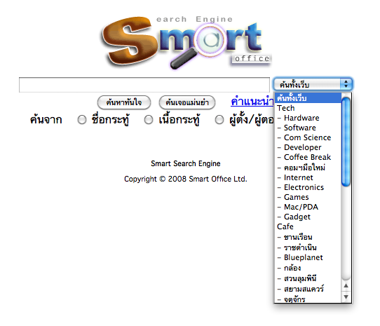 Pantip.com เป็นเว็บบอร์ดคุณภาพของไทยที่อยู่คู่กับคนไทยมานับสิบปี ซึ่งใช้ Search Engine ไทยชื่อ Smart Office ในการค้นหากระทู้ต่างๆ ในเว็บโดยเฉพาะตรงส่วน Café ที่มีคนเข้าไปแลกเปลี่ยนความคิดเห็น เกี่ยวกับทุกๆ เรื่องตั้งแต่สากกระเบือยันเรือรบ ตลอดจนสินค้าและบริการ ต่างๆ ด้วย