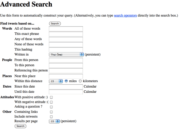 โชคดีที่ว่าทาง Twitter นั้นมี Advanced Search ให้เราเลือกค้นหาเฉพาะข้อความทวีตที่เป็นภาษาไทยได้ด้วย ดังนั้นเมื่อผมเข้าไปที่ Twitter Search แล้วจัดการเลือกภาษาไทยซะ แค่นี้เราก็จะเห็นว่าคนไทยซึ่งทวีตว่าอย่างไรถึงสินค้าและบริการของเรา เมื่อเราพบว่าดีก็ควรพัฒนาต่อไป เมื่อพบว่าอะไรไม่ดีก็ต้องรีบแก้ไข