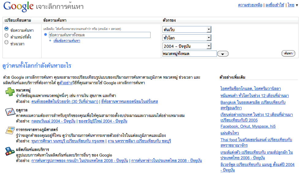 สำหรับ Google เจาะลึกการค้นหานั้นไม่ได้เน้นว่าเราจะดูว่าคนสนทนากันว่าอย่างไร แต่เราจะดูได้ว่า ณ ตอนนี้มีคนสนใจในสินค้าและบริการของเราแค่ไหน เพราะมันจะโชว์ว่ามีคนเสิร์ชหาสินค้าและบริการของเราแค่ไหน และแสดงออกมาเป็นกราฟให้เห็นได้ชัดๆ พร้อมกับการเลือก ภาษาไทยให้เราได้เลยเช่นกัน เข้าไปลองเลยที่ http://www.google.com/insights/search/?hl=th