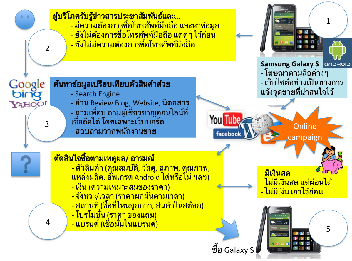 จากภาพข้างบนนี้ จะเห็นได้ว่าในจุดสำคัญทั้ง 5 จุดนั้น แคมเปญออนไลน์สามารถเข้าไปมีบทบาทสำคัญได้แน่ๆ 2 จุดคือเบอร์ 1 กับเบอร์ 3