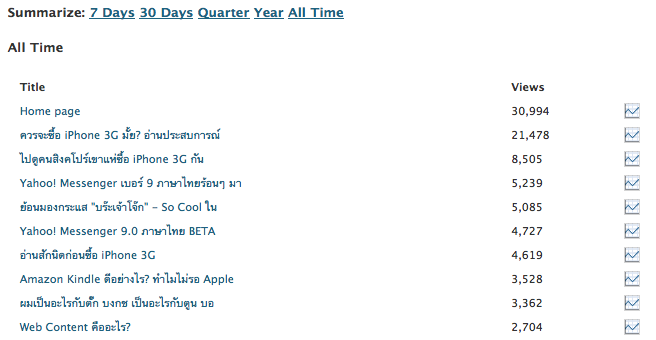 ผมชอบนั่งดูสถิติเว็บตัวเองครับ สนุกกับการเขียน และได้รู้ทันทีว่าใครชอบอ่านอะไรไม่ชอบอ่านอะไร อันนี้เป็น Stat ย้อนหลังให้คุณได้ดูกันเล่นๆ นะครับ