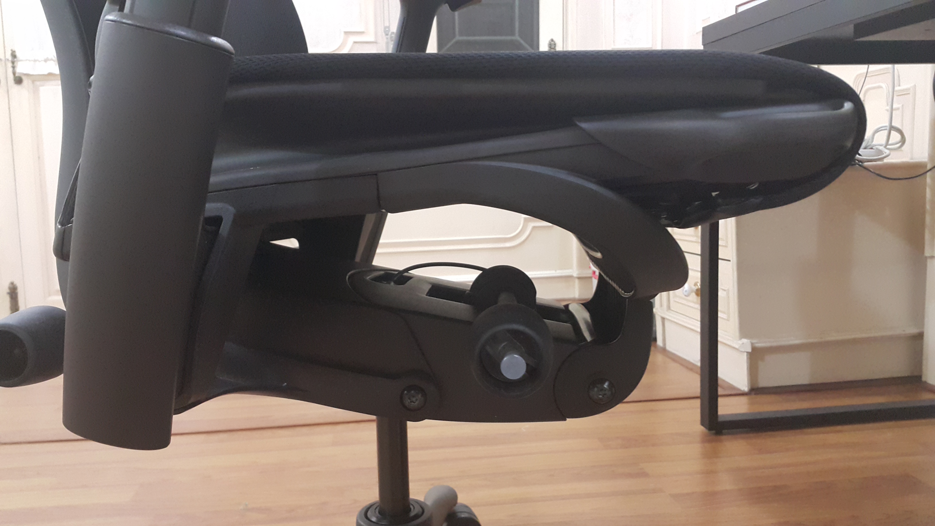 ผมลองนั่งดูตอนแรกรู้สึกว่าหลังมันกระโดกกระเดกไปหน่อย เลยลองจับลูกบิดตัวแรกตามรูปนี้ครับ ปรากฎว่ามันปรับ “ความหนืด” ของเก้าอี้ได้เมื่อเราเอนหลัง และลูกบิดตัวเดียวกันนี้ก็จะทำหน้าที่เคลื่อนเก้าอี้ขึ้นลงได้แบบเก้าอี้สำนักงานทั่วไปครับ